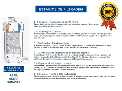 A água atravessa a tela texturizada de 150 micra, fornecendo água límpida, transparente, sem gosto e sem cheiro.