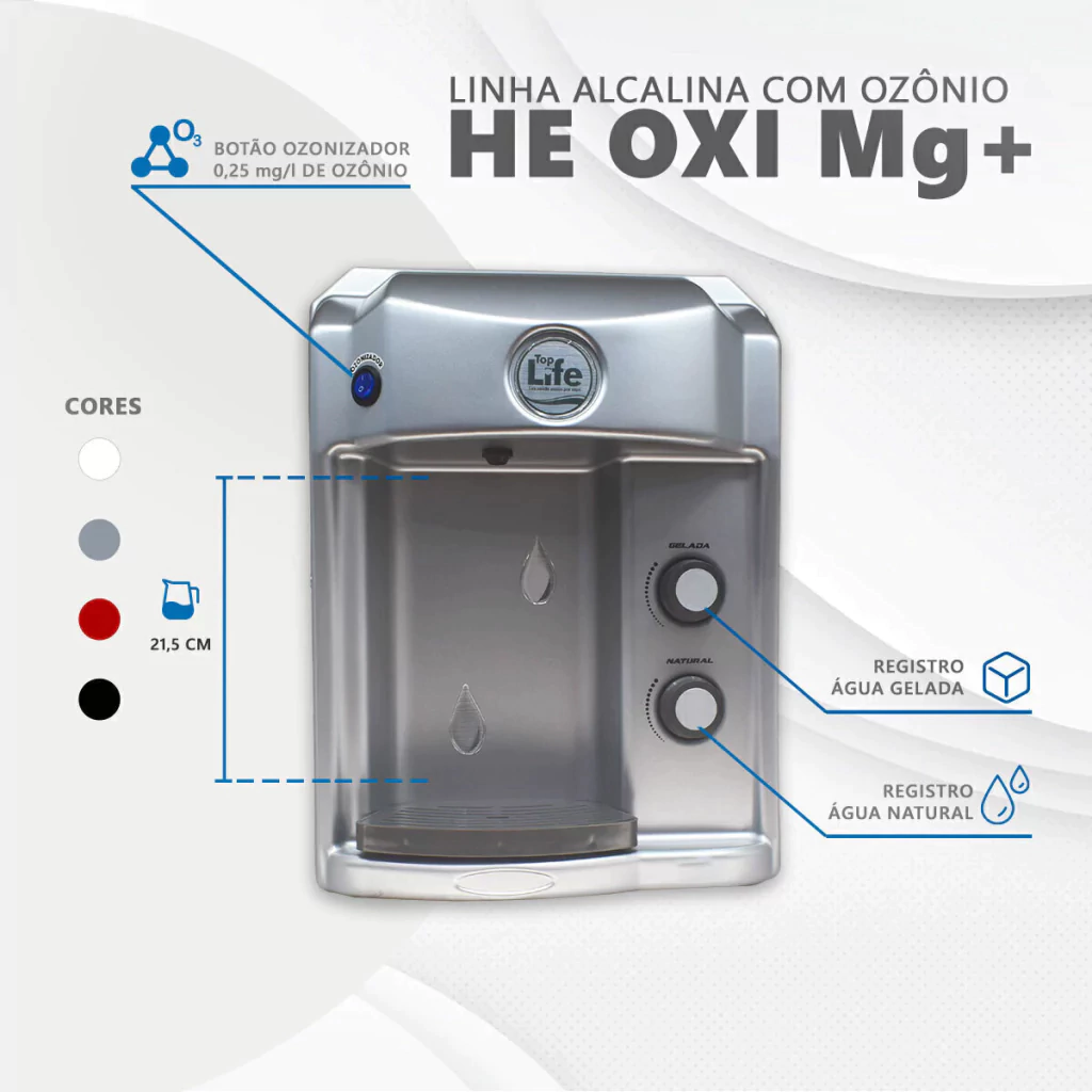 - O purificador HE OXI Mg+ da TOP LIFE não é apenas um filtro, ele é uma supermáquina capaz de deixar a água purificada, alcalina (com adição extra de Magnésio), ionizada, refrigerada e ozonizada.